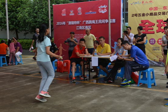 比赛当天南宁华南城下起倾盆大雨,依然挡不住江南区人民对体育运动的热情,比赛吸引了150多人到场参赛。比赛分为单人10分钟跳绳和三人家庭3×60秒接力跳绳,有87人参加单人10分钟跳绳,四组家庭参加三人家庭3×60秒接力跳绳。比赛中选手们统一采用双脚跳起的跳绳方法,规定时间内谁跳的数量多则胜,来自南宁38中附属小学的姚飞粤同学以1581个的成绩获得全场最高分。最终决出的单人10分钟跳绳前八名和三人家庭3×60秒接力跳绳前四名均获2016年“澳瑞特杯”广西跳绳王民间争霸赛江南赛区奖励证书和奖金,并将代表江南赛区参加南宁市晋级赛。