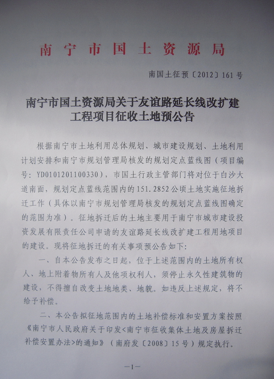 南国土征预[2012]161号 友谊路延长线改扩建工程项目征收土地预公告