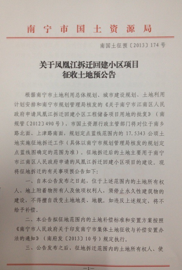 南国土征预﹝2013﹞174号 关于凤凰江拆迁回建小区项目征收土地预公告
